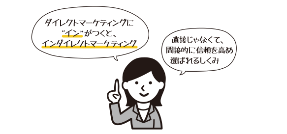 「Indirect」は「Direct(直接的)」の否定形で、“間接的な”を意味します。 つまりインダイレクトマーケティングとは、押し売りを避け、お客様が自らブランドや商品を選びたくなるように導くマーケティング手法です。
