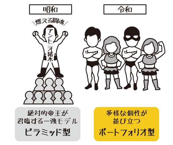 - 昭和(一強モデル): アントニオ猪木のような“絶対的帝王”への排他的な熱狂。「他は認めない」という独占の論理。